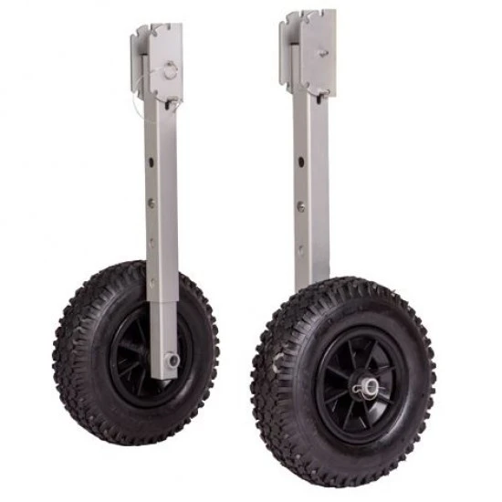 Juego de ruedas de transporte de aluminio ligero con neumáticos, adecuado para botes inflables, botes pequeños de poliéster o aluminio. La altura se puede ajustar fácilmente telescópicamente en 4 alturas diferentes de 57,5 cm a 77,5 cm medidos desde el centro del punto de pivote hasta la parte inferior de la rueda en el suelo. Las ruedas también son muy fáciles de plegar hacia arriba y hacia abajo por medio de un pasador de bloqueo con resorte. El plegado hacia arriba y hacia abajo también se puede hacer en 4 posiciones diferentes (2 arriba, 2 abajo), lo que hace que el conjunto también sea muy adecuado para espejos no exactamente verticales o espejos con partes sobresalientes. Además, toda la pata con rueda se puede quitar fácilmente tirando de un pasador de bisagra asegurado, por lo que no se requieren herramientas.