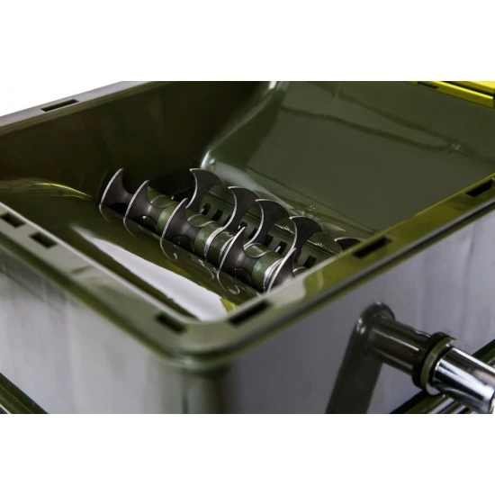 Con Ridgemonkey Advanced Boilie Crusher, puede triturar un kilo de boilies en pedazos pequeños en un minuto. Debido a que las cuchillas están a diferentes distancias entre sí, todas obtendrán piezas desiguales. Encaja exactamente en el cubo modular de 17 l que viene con este juego completo de serie. Gracias a la manivela desmontable y la bolsa de transporte, es fácil de transportar. Es ideal para hacer rápidamente un spod mix, pva bag o simplemente un engodo. En resumen, ¡este es un gran artilugio que todo pescador de carpas de ribera debería tener! Las cuchillas de corte están hechas de acero inoxidable resistente a la corrosión. Las hojas de corte desiguales crean un patrón para piezas de todos los tamaños. La cubierta protectora garantiza que pueda trabajar de forma segura con esta trituradora avanzada Ridge Monkey.