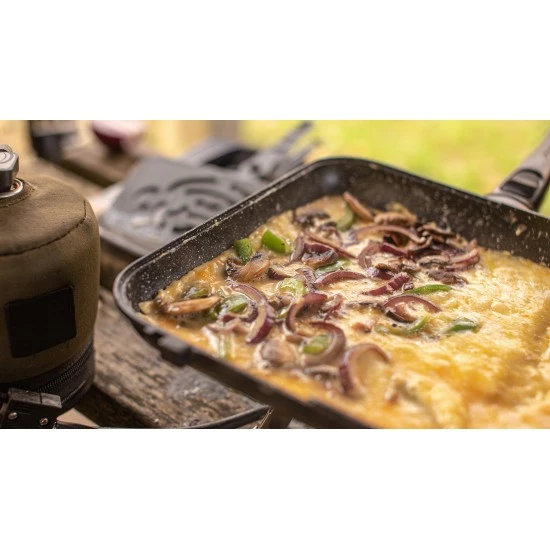 Connect Pan & Griddle XXL Granite Edition cuenta con manijas desmontables frías al tacto y un sistema de bisagra desmontable que convierte una sartén en dos: una de fondo plano y una parrilla separada. Connect Pan & Griddle XXL también viene con un rallador de queso y una gran espátula Q-Lock. El set es ideal para tortillas grandes, pizzas, pasta, tortillas, desayunos, etc., pero también perfecto para cocinar para varias personas. Nuestro nuevo revestimiento estilo granito hace que nuestras sartenes sean más fuertes, más duraderas y ofrece propiedades antiadherentes mejoradas, lo que lleva los utensilios de cocina compactos a un nivel completamente nuevo.