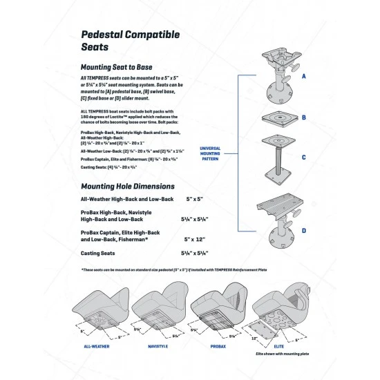 - Patrón de perno de asiento universal 5.25″ x 5.25″