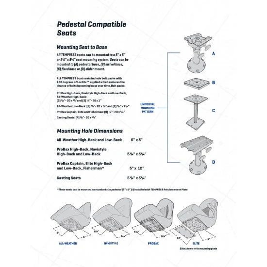 - Fácil instalación; acepta cualquier pedestal o sistema de montaje de asiento de barco de 5 ¼» x 5 ¼»